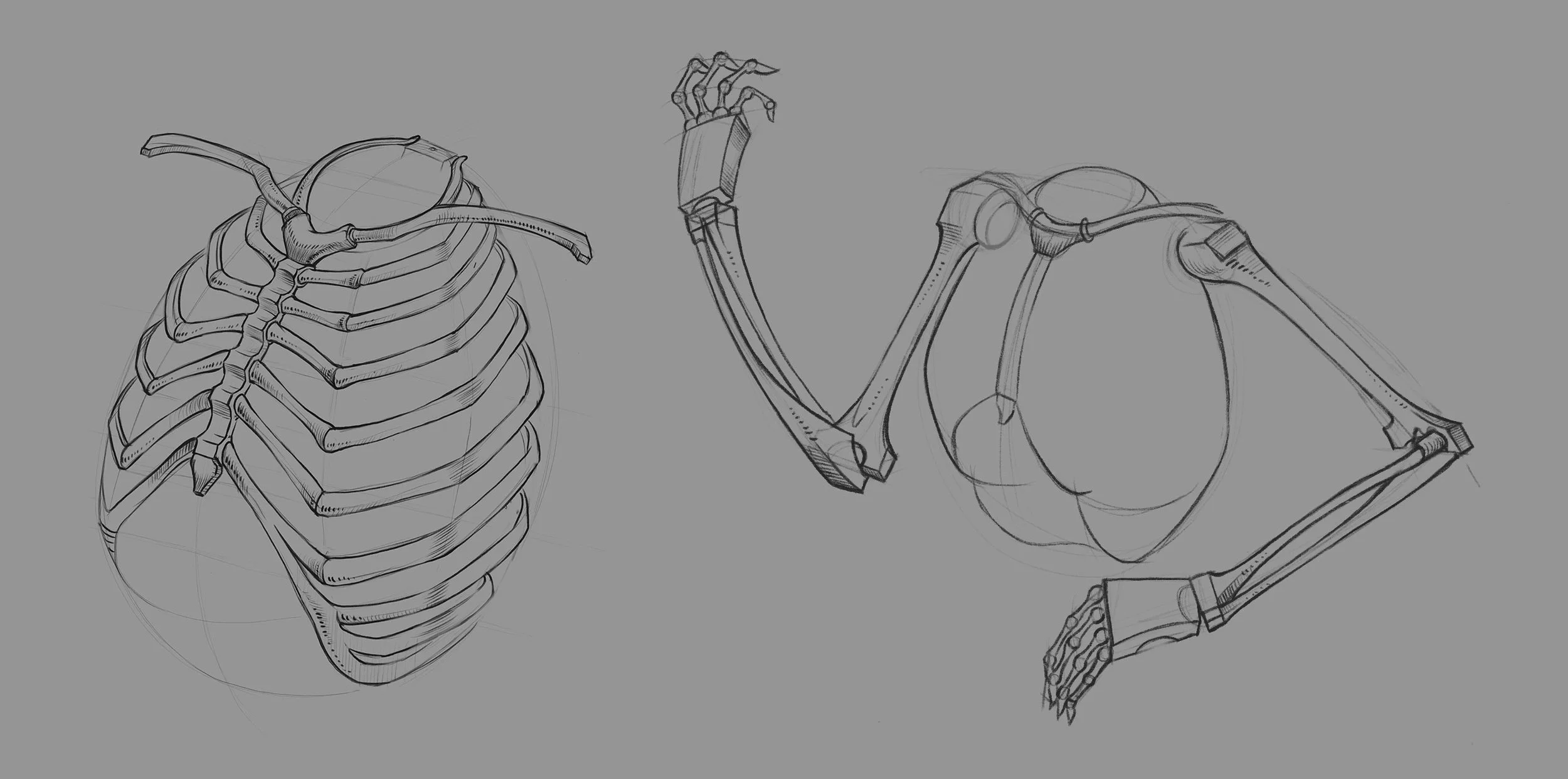 It all began with drawing bones. The main parts are the pelvis and ribs.